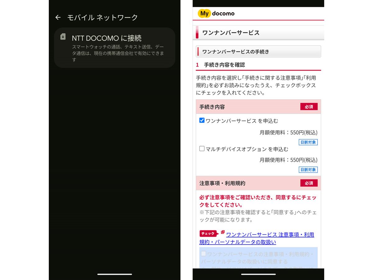 ちなみに、筆者が契約している回線では、ソフトバンク回線は「ウェラブルデバイスモバイル通信サービス」(月額385円/4年間無料)に加入でき、ドコモの「ワンナンバーサービス」と同じように利用できた。auは「ナンバーシェア」(月額385円)が利用できるが、筆者が持っているUQ mobilleとpovoは対応していなかった。