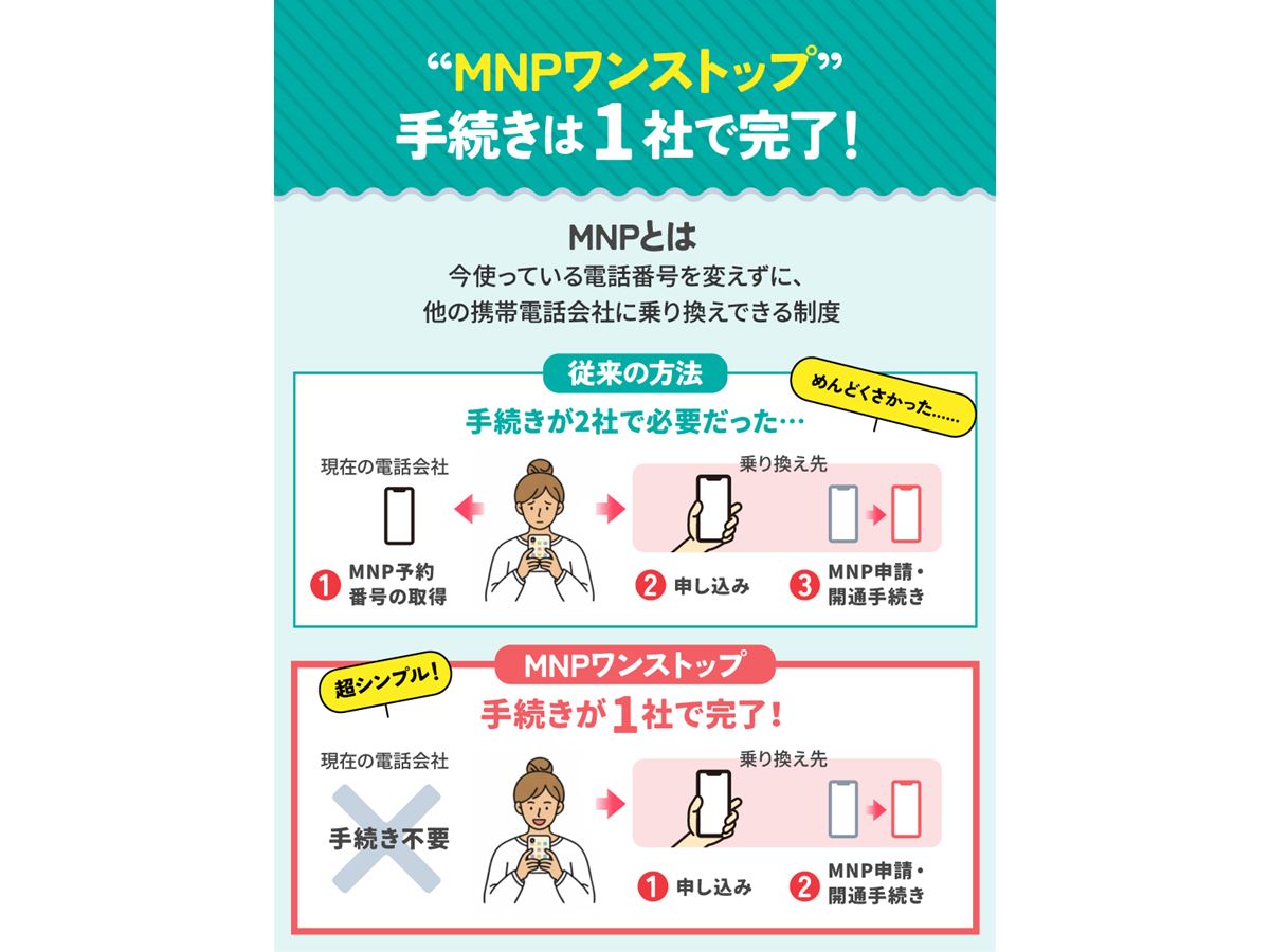 ”MNPワンストップ”とは、電話番号はそのままでキャリアを乗り換える場合でも、転出元での手続きが不要な新しい乗り換え方式です。これから契約するキャリアだけで手続きすればよいので、お手軽・お気軽に乗り換えられます。