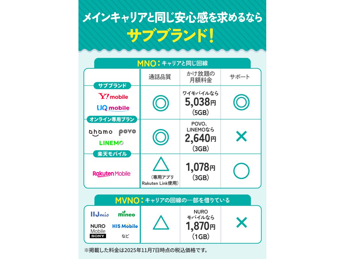 価格はやや高いけれど通話品質を重視するか、不安定だが安さを重視するかで、選ぶべきキャリアが変わります。たとえば、仕事など重要な用件で通話をすることが多いのであれば通話品質を重視してメインキャリアの「サブブランド」や「オンライン専用プラン」を。反対に、お店の予約など短時間で終わる通話がメインならば「楽天モバイル」を、といった具合に選びましょう。