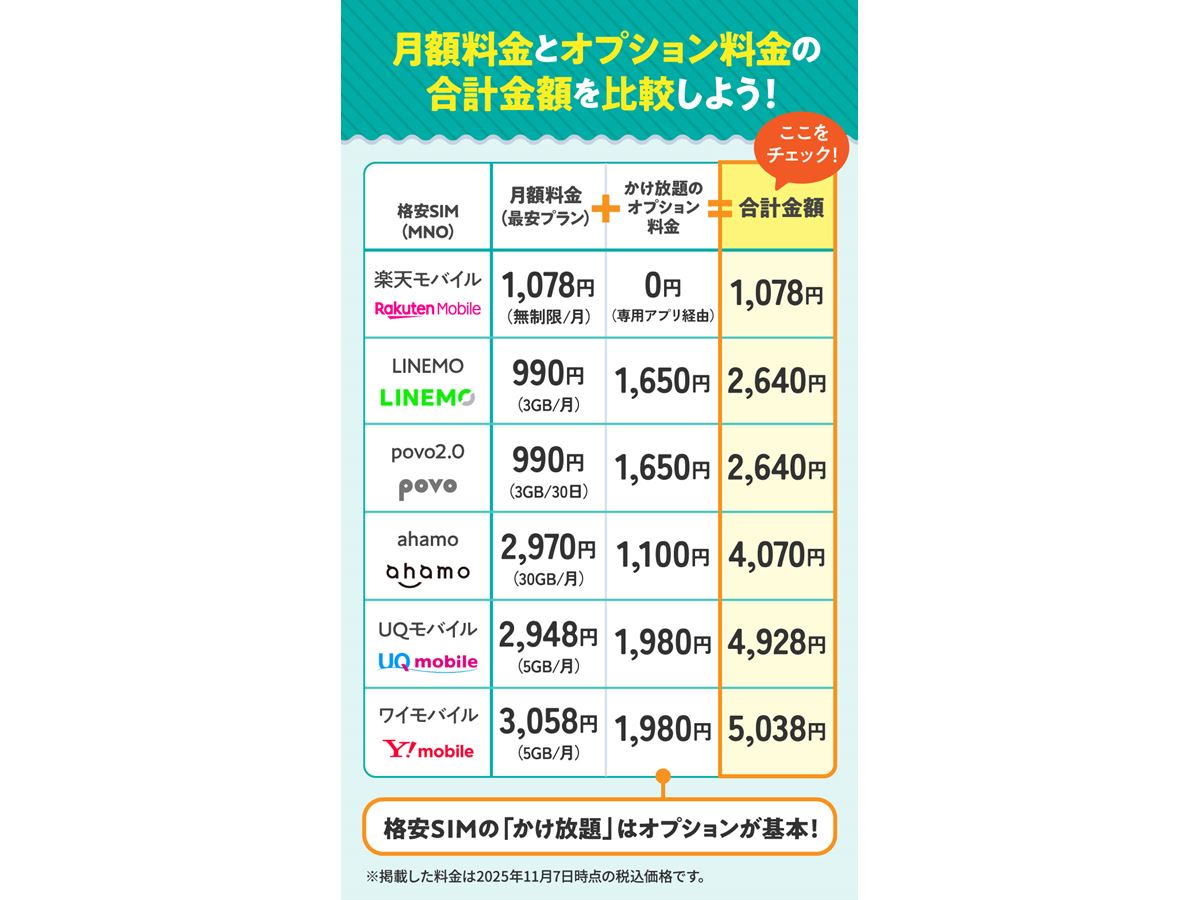 格安SIMの「かけ放題」は、基本のプランに含まれていないことが多く、オプションとして追加する場合が多いです。そのため、実際の支払い金額を把握するには、プランの基本料金と「かけ放題」オプション料金を合算した合計金額を計算する必要があります。