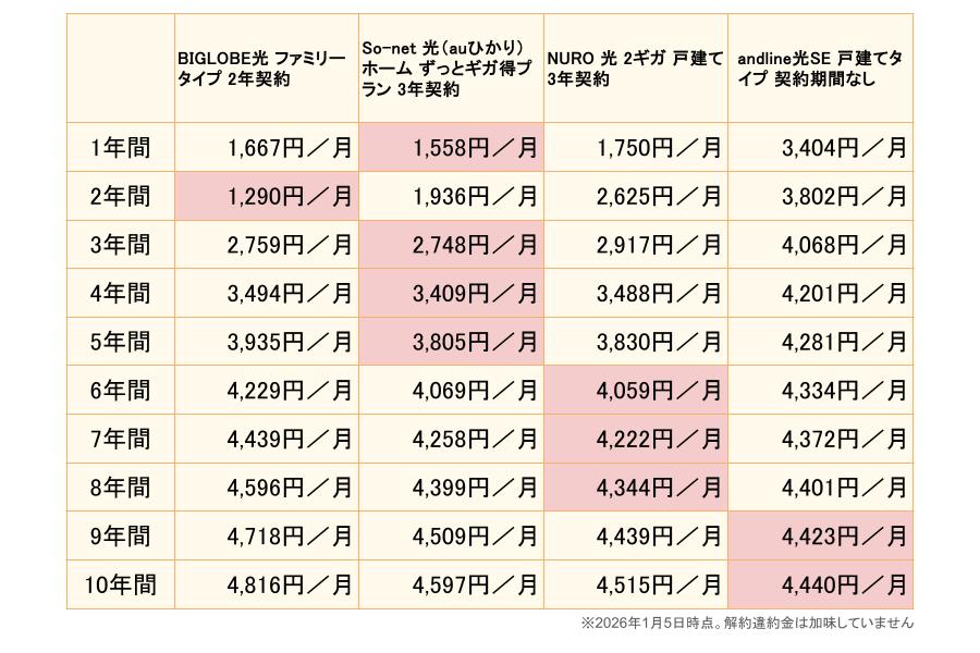 ・長期の継続利用で最安を目指せる「andline光SE 戸建てタイプ 契約期間なし」