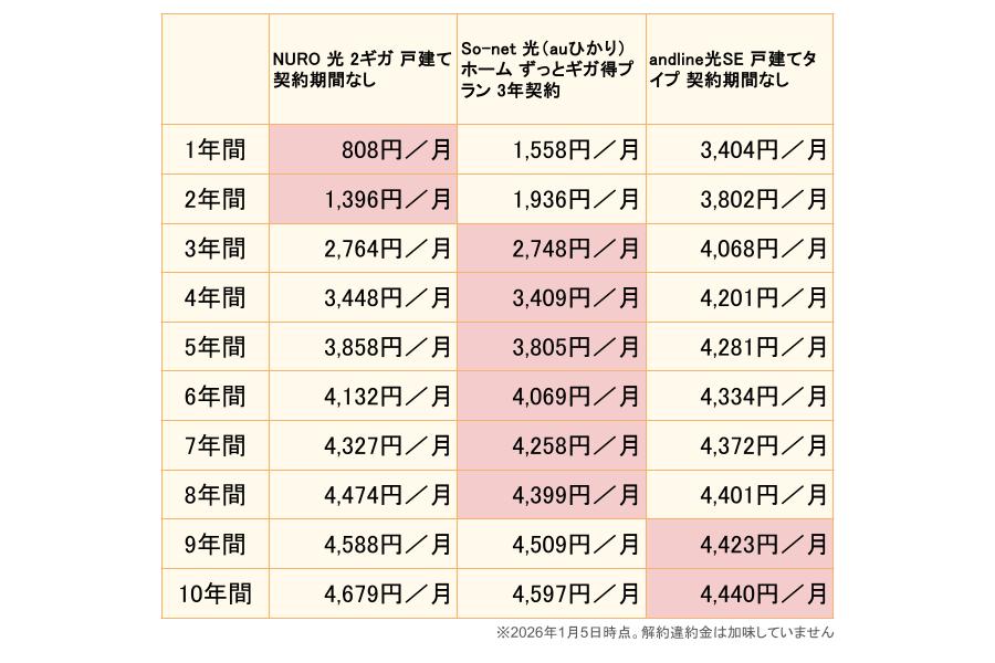 この記事では究極の安い光回線プランとして、マンション向けは「BIGLOBE光 マンションタイプ 2年契約」、戸建て向けは「andline光SE 戸建てタイプ 契約期間なし」をおすすめしています。 ただし、利用期間によって一番安いプランは変わります。この記事では条件別におすすめプランを6つ厳選していますので、自分の利用条件を意識しながらチェックしてみてくださいね!