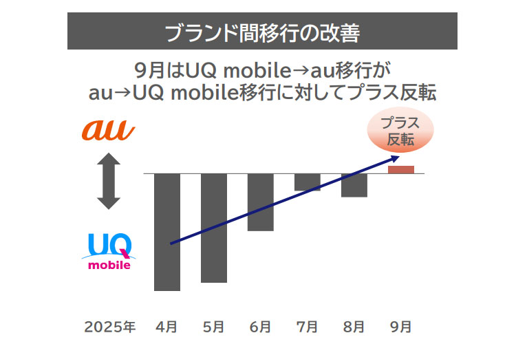 携帯各社はサブブランドや低価格プランから、メインブランドや高価格プランへの移行を積極的に進めており、KDDIは2025年9月に「UQ mobile」から「au」への移行がその逆を上回ったとしている(出所:KDDI)