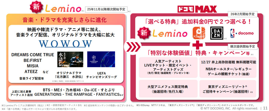 NTTドコモは「WOWOW」との提携により「Lemino」のコンテンツ強化を発表。2026年2月には「ドコモ MAX」に、その「Lemino」を加えた4つの映像配信サービスから2つを選べる「選べる特典」を追加し、スポーツに興味のない人達の取り込みを強化しようとしている(出所:NTTドコモ)