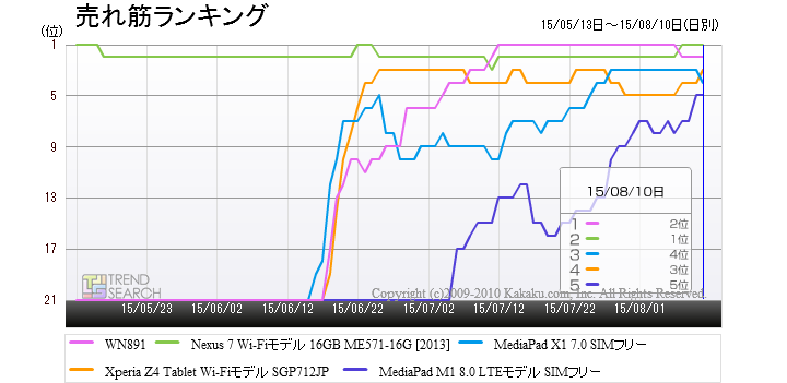 上の図は、本製品とよく購入比較をされるライバル製品を表した「ライバルランキング」で、図中の「勝率」は比較された結果、本製品がどれだけの確率で選ばれたかを示している。これを見ると、本製品のライバル1位は、HuaweiのSIMフリータブレット「MediaPad X1 7.0 SIMフリー」で、こちらには負け越しているが、そのほかでは勝ち越している。ライバル上位製品には、SIMフリー仕様のAndroidタブレットや低価格なWindowsタブレットなど、高機能なモデルの姿も見られるが、やはり価格面でのアドバンテージが大きく左右しているものと思われる。発売から2年近くを経た製品としては、異例の人気といえる。