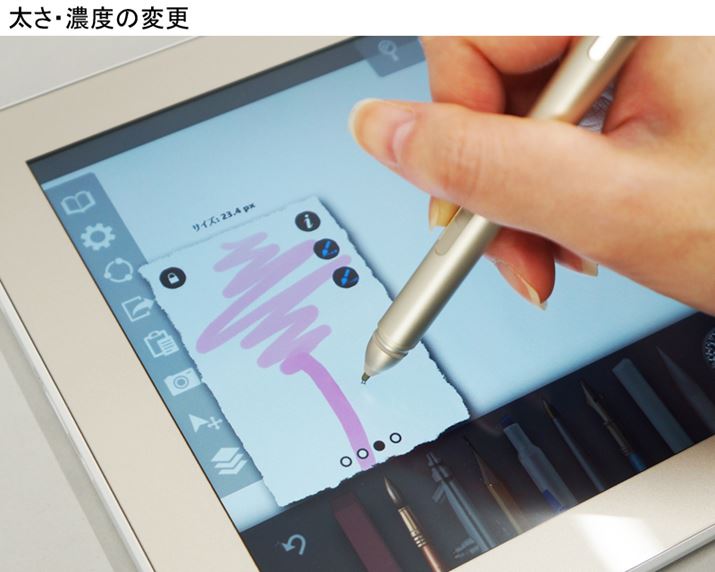 線の太さや濃度は、下の動画のようにデジタイザペンを縦横に動かして変えます。無段階で選べるのがいいですね。