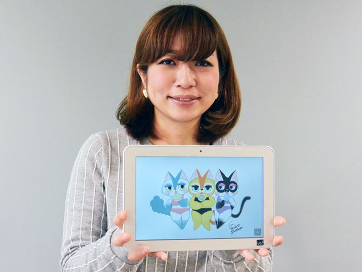 「dynabookTab S80/NG」での“デジタルお絵描き”に挑戦してくれたイラストレーターのユザワエミコさん。雑誌やWebサイトでイラストやマンガを描かれています。動物のイラストを描くのが一番好きとのことですが、対面して話ながら似顔絵を描いたりもしているそう。また、LINEスタンプにも写真のキャラを提供中