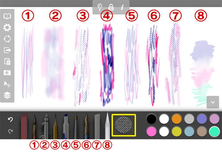 筆やエアーブラシ、鉛筆、万年筆など、複数のペンが用意されており、太さや濃度が変えられます
