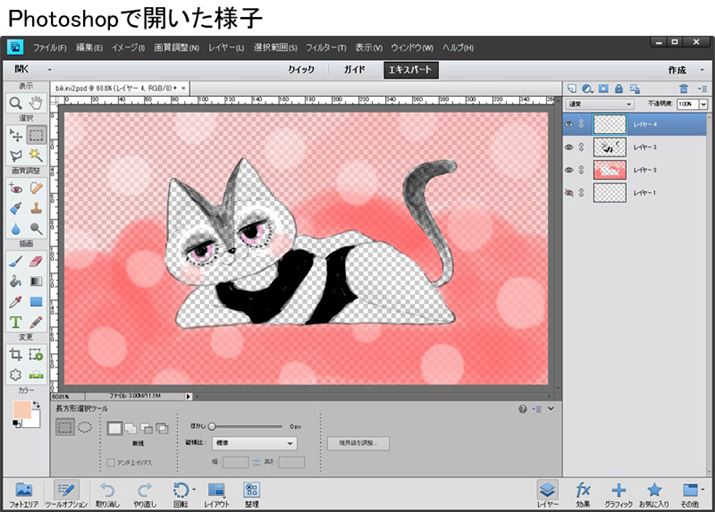 「Photoshop形式で保存したものをPhotoshop Elementsで開いてみると、レイヤーが残っていました。印刷物に対応する解像度350 pixelにすると、等倍で印刷物に掲載されるサイズは99.3(幅)×55.73(高さ)mmになります。印刷所に入稿できる作品は、小さめのカットに限られるかもしれません。しかし、解像度72pixelの場合、サイズが481.89(幅)×270.93(高さ)mmとなるので、Webで使う分には十分!」
