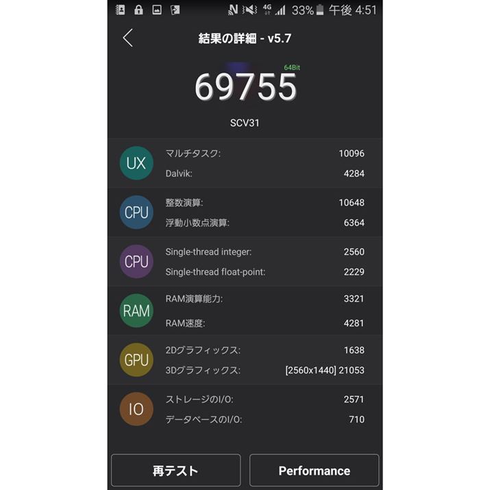 ベンチマークテストアプリ「Antutuベンチマーク 64bit版」の総合スコアは69755となった。ひとつ前の世代に属するGALAXY Note edgeのスコア48000〜49000程度と比較して、大幅に向上していることがわかる