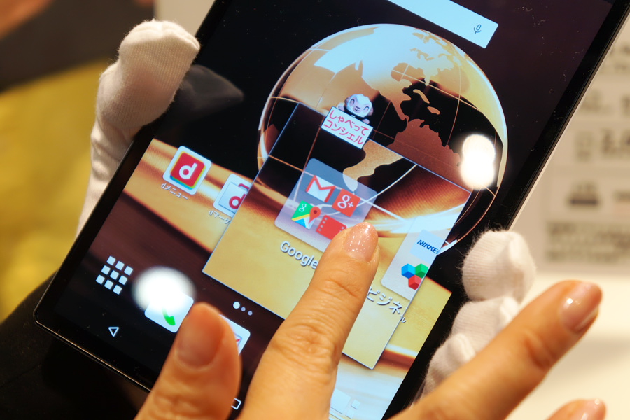 1200×1920のWUXGA表示に対応する約7.0インチのIGZO液晶を備えたAQUOS PAD SH05G。計測中だが重量が210g台に抑えられており、従来機種の「SH-06F」の約233gよりもさらに軽く仕上がった。オクタコアプロセッサー「Snapdragon 810 MSM8994」に、2GBのメモリー、32GBのストレージを備えている。OSはAndroid 5.0となっている