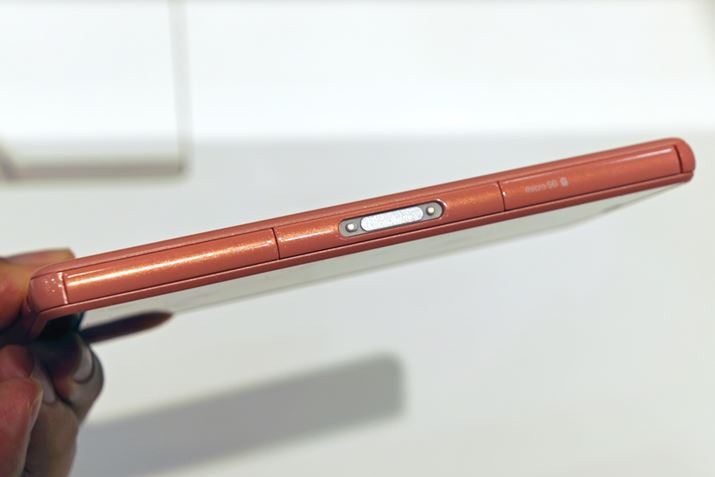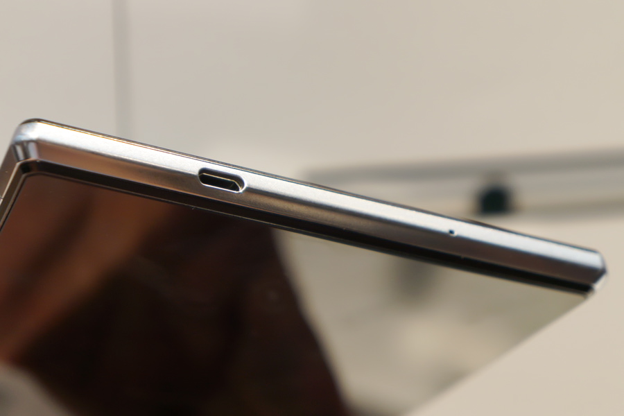 側面には、卓上ホルダーと接続する端子が見える。また、Xperia Z4と異なり、こちらのmicroUSBポートは防水キャップで覆われている