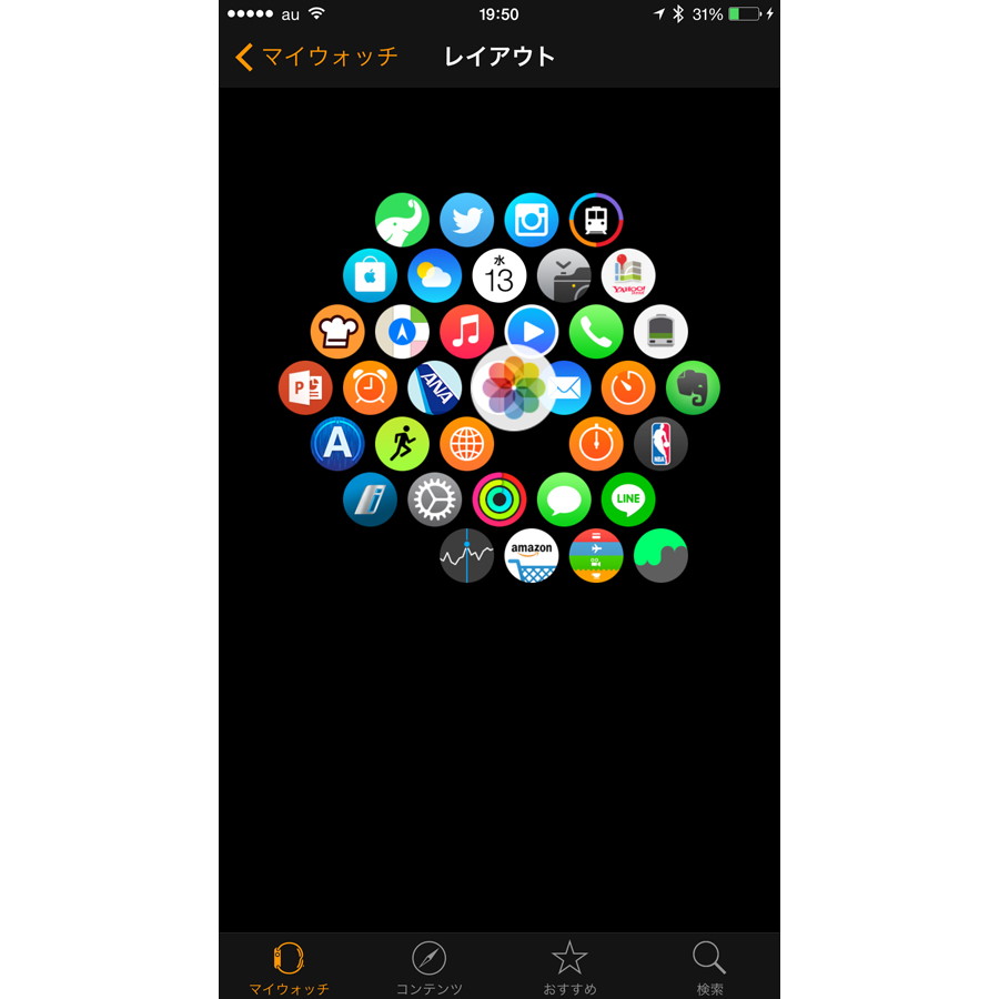 インストールしているアプリは、Apple Watchアプリの「Appのレイアウト」で確認できる。よく使うアプリを中央に配置すれば使いやすくなるので、好みにカスタマイズするとよいだろう。アプリの移動は、iPhoneのアプリの移動と同じように、長押ししてから好みの場所に動かす。