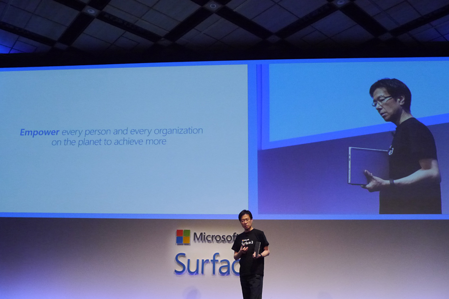 発表会には米マイクロソフトのブライアン・ホール氏が登壇し、「モバイルしやすく、価格を下げることで、より多くの人に使ってもらえるタブレットに仕上げた」と述べた。LTE対応にも触れ、LTE対応モデルを投入するのは日本が最初であることも強調した。日本マイクロソフトの樋口泰行社長は、「これまでマイクロソフトはPC、Windows、Officeとバラバラだったが、サティア・ナデラ新CEOのもとで、ユーザーの利便性を一番に考えながら、エコシステムを再構築しようとしている。こうした新しい考えが今回のSurface 3に反映されている」と語り、今夏リリース予定のWindows 10とともに、Surface 3を戦略的な商品と位置付ける。