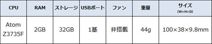32GBのストレージを備えたファンレスタイプのスティック型PC。50g前後が多いスティック型PCとしてはやや重めな約70gという重量で、サイズも少し大きめだが、それは内部に大型のヒートシンクを備えているため。このヒートシンクのおかげで、ファンレスながら余裕のある冷却が行える。しかも駆動部分がないため、騒音も少なくほぼ無音だ。ファンレスによる静音性だけでなく冷却性も兼ね備えた1台となっている。