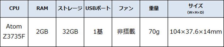 サイズも、USBメモリーをひと回り大きくした程度のポケットサイズで、持ち運びも苦にならない。価格は2万円前後が主流で、値ごろ感も高い。処理性能については、一般的なWindowsタブレットとほぼ同等で、Webコンテンツの閲覧、メールやSNSの利用にとどまらず、ストリーミング動画の再生などメディアプレーヤーとしても利用できる性能を備えている。