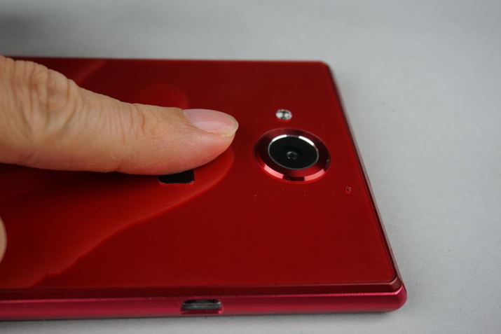SH-03Gは、背面のカメラ下に指紋認証センサーを搭載している。指紋認証と言えば、富士通やアップル、サムスンなどがこれまでも搭載していたが、シャープとしては、ケータイ時代を含めて初めての試みになる。