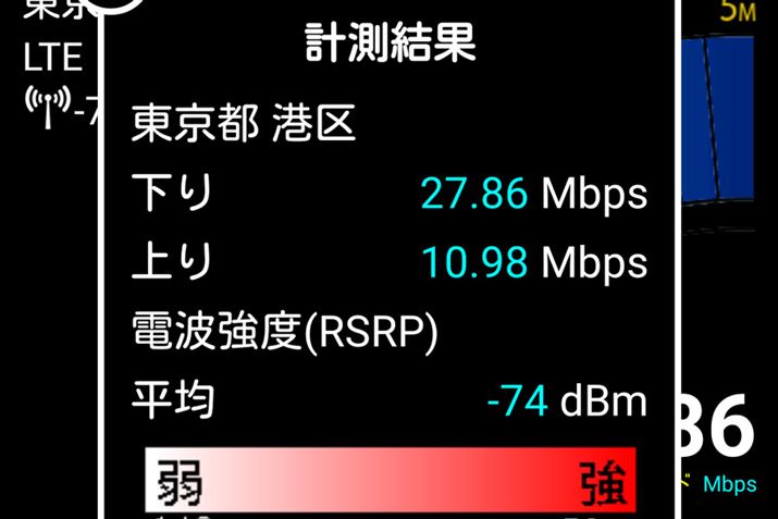 PREMIUM 4G対応のJR新橋駅で、朝9時台に計測を3回行ったうち最速だったスコアが下りで27.86Mbpsとなった。プレミアム4G非対応機種では大体15Mbps程度の速度なので、ざっと倍近い速度となる