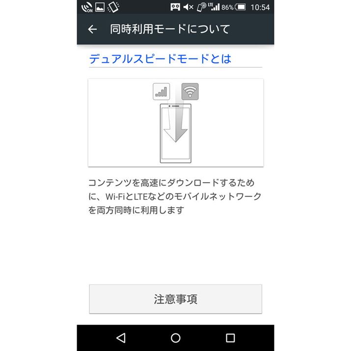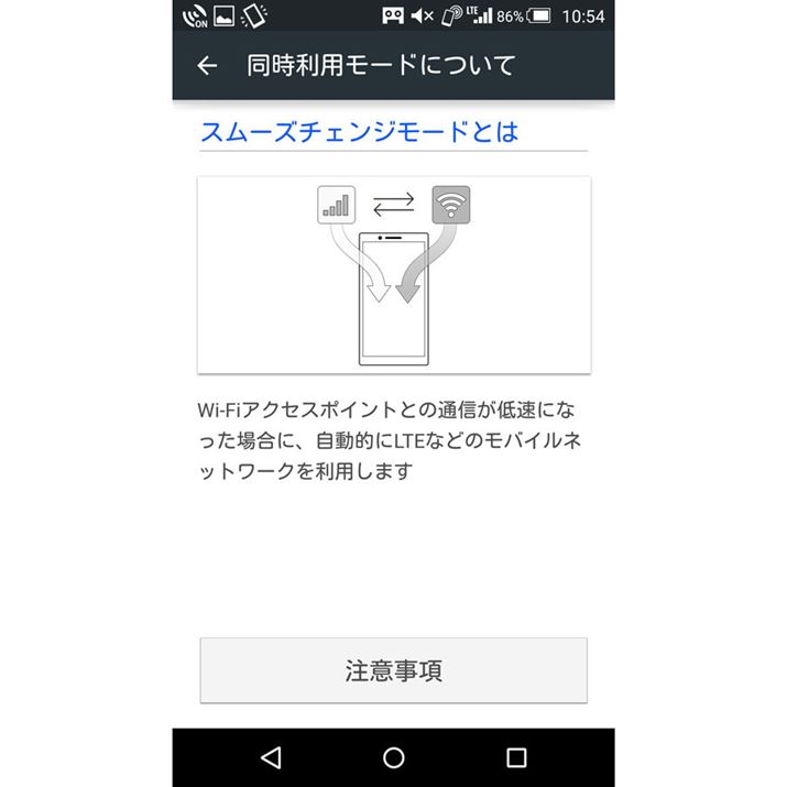 スムーズチェンジモードは、Wi-Fiの通信速度が低速になった場合、自動的にLTE回線などのモバイルネットワークを利用する