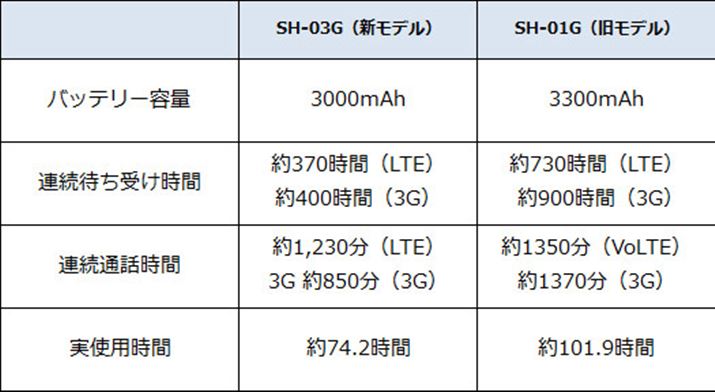 まずは、SH-03Gのバッテリー関連のスペックを見てみよう。搭載されるバッテリーの容量は3000mAhで、連続待ち受け時間は約370時間(LTE)/約400時間)(3G)、連続通話時間は約1120分(LTE)/約800分(3G)となっている。これを、旧モデルSH-01Gのバッテリー性能と比較してみた。以下の表をご覧いただきたい。