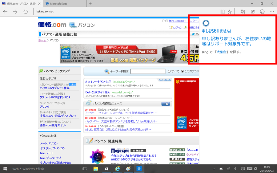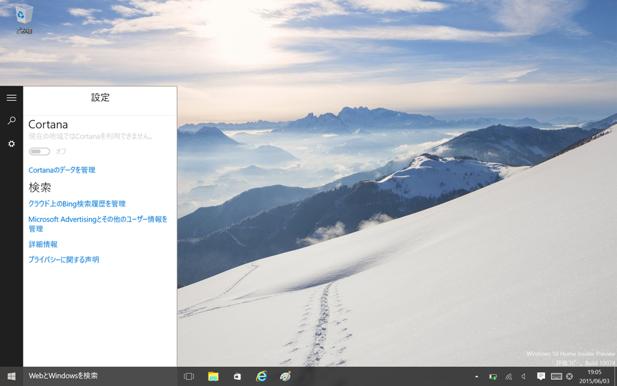 Cortanaをインサイダープレビュー版で試したところ、「お住まいの地域はサポート対象外です」という表示が出た。現時点では日本および日本語での利用はできない