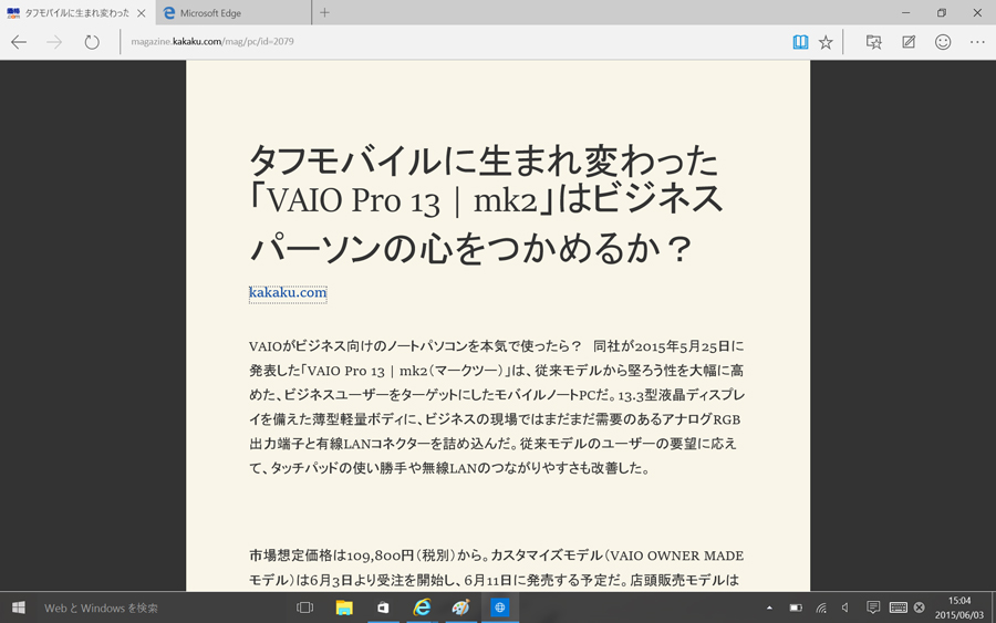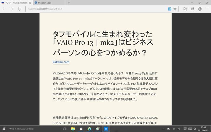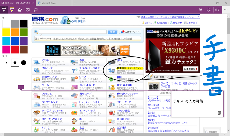 特徴的な機能が、手書きでメモを書き込めること。気になるところにメモを残して、画像として保存し、ほかのアプリを使ってシェアしたりできる。また、表示中のWebページが記事の場合、広告を非表示にして読みやすいレイアウトにすることも可能だ。前述のCortanaとも連携している。なお、Windows 10にはInternet Explorerとの互換性を重視するユーザー向けに、Internet Explorerも引き続き搭載される。