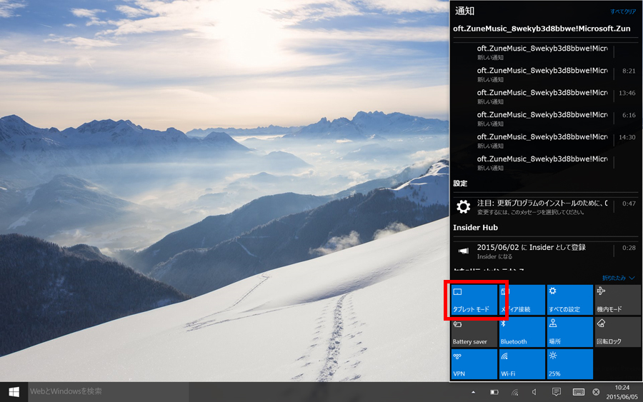 タブレットモードは、アクションセンターからオン・オフできる。画面はタブレットモードをオンにした状態で、ゴミ箱やフォルダが非表示となっている