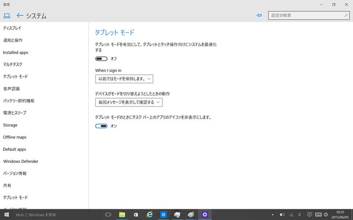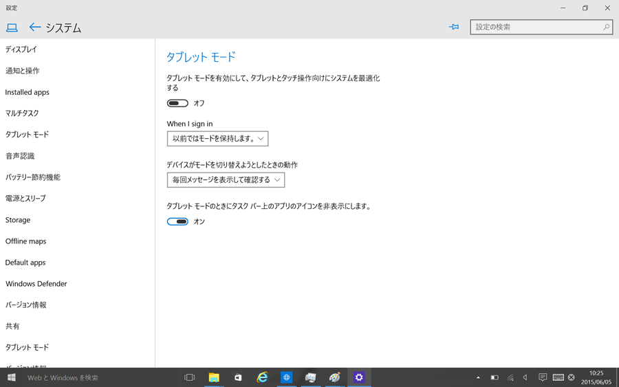 タブレットモードの設定画面。「デバイスがモードを切り替えようとしたときの動作」という項目があるところを見えると、2in1タイプのデバイスの場合は、キーボードの脱着によりモードの切り替えを自動で行えるようだ