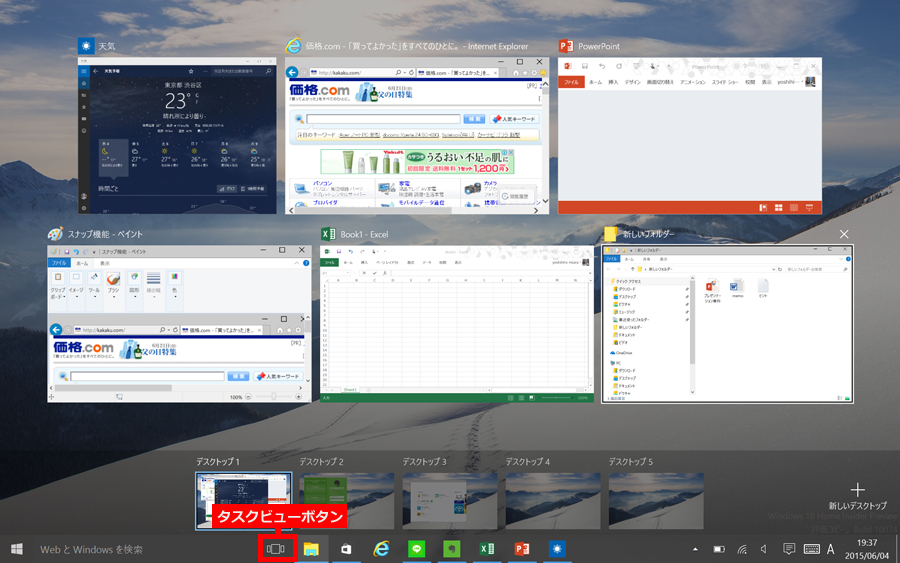 画面左端を外から内へスライスルと、新機能であるタスクビューが表示される。起動中のアプリやエクスプローラーがサムネイル表示され、使いたいアプリなどをクリックまたはタップすると最前面に表示される。マウス操作の場合はタスクバーにあるタスクビューボタンをクリックするとタスクビューが表示される