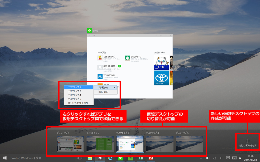 タスクビューからは、新機能のひとつである「仮想デスクトップ」も利用できる。仮想デスクトップとは、ひとつのディスプレイを仮想的にマルチディスプレイ環境として利用できる機能だ。仮想デスクトップは、タスクビューの下で切り替えられる。たとえば、「デスクトップ1」にWebブラウザーと文章作成ソフト、「デスクトップ2」にLINEとTwitterを表示し、作業内容に応じて2つのデスクトップを使い分けられる。