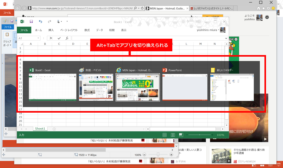 Windows 10では、アプリの切り替え方法が変わる。Windows 8/8.1では、画面左端を外から内へスライドするとストアアプリを切り替えられたが、Windows 10では「タスクビュー」という新機能が表示されるようになった。タスクビューを開くと、起動中のアプリやエクスプローラーがサムネイル表示される。ストアアプリとデスクトップアプリの区別はなく、使いたいアプリやフォルダをクリックまたはタップすると最前面に表示される。これで使いたいアプリなどを切り替えられるのだ。マウス操作の場合は、タスクバーにあるタスクビューボタンをクリックするとタスクビューが表示される。従来のWindowsと同様、Altキー+Tabキーによるアプリの切り替えも可能だ。