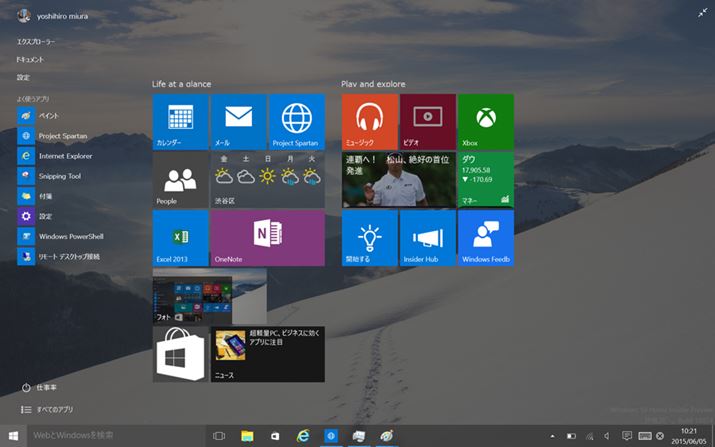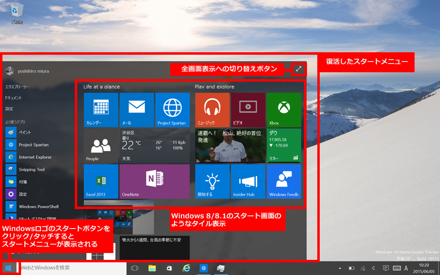 Windows 10のインサイダープレビュー版をインストールしたパソコンを起動してログインすると、Windows 8/8.1のスタート画面ではなく、デスクトップ画面が表示される(Windows 8.1では設定で変更可能)。最初に目に付くのは、スタートメニューが復活したことだ。スタートメニューは、タスクバーの左端にあるWindowsロゴのスタートボタンをクリックまたはタッチすると表示される。Windows 10のスタートメニューの右側には、ストアアプリなどがタイル表示されており、Windows 7のスタートメニューとは異なっている部分が多い。ひと言でいえば、「8.1のスタート画面と7のスタートメニューを組み合わせたもの」とでも言えるだろうか。スタートメニューの右上のボタンをクリックまたはタッチすると全画面表示になる。ちょうど、Windows 8/8.1のスタート画面に近いもので、キーボードを装備しないタブレットなどでは、こちらのほうが使いやすいだろう。