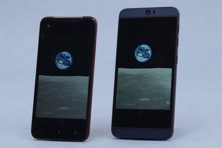 旧機種のHTL21を左に、HTV31を右に並べて月面のクレーター画像を表示してみた。クレーター部分の情報量の増大に高解像度化の影響が見て取れる。また、漆黒の宇宙の表現でもIPS-NEOパネルの優位性が感じられる
