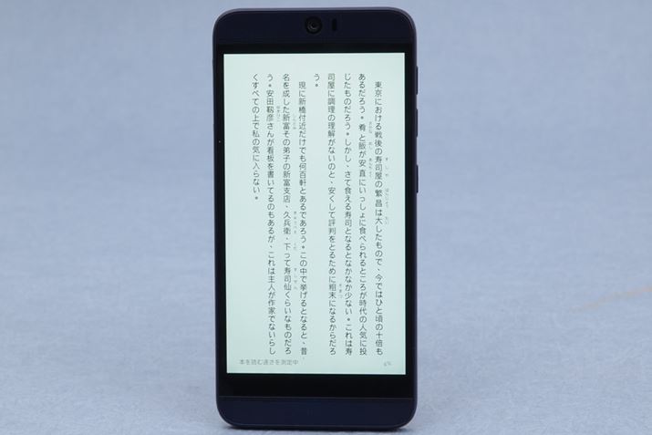 ぱっと見たときのインパクトより、使い続けたときの実用性を重視したHTC製スマホのディスプレイは、ホワイトバランスをいたずらに吊り上げていない。電子書籍の背景は、輝く白と言うより、目をいたわるなめらかな白だ。WQHD表示はさすがに緻密で、細かなルビまでフォントの質感が再現できている