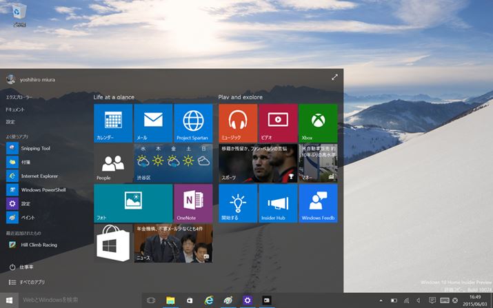 スタートメニューが復活したWindows 10。マウスとキーボードを使った操作がしやすくなっている。タッチ操作向けの「タブレットモード」というユーザーインターフェイスも備え、タブレットでも使いやすい。画面は開発途中のインサイダープレビュー版(Build 10074)