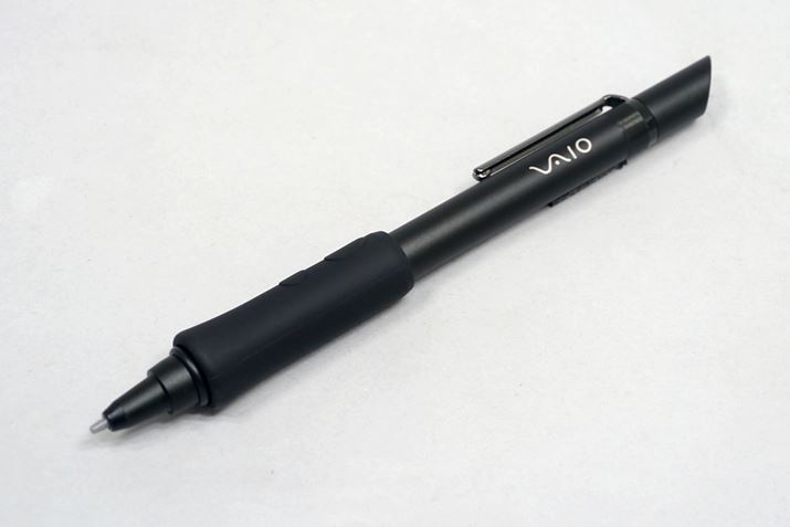 デジタイザースタイラス(ペン)の最大分解能は1024段階で、「VAIO Z」と同じものが付属する。摩擦係数の違う2つのペン先が付属するのも同じだ。筆圧カーブ調整機能を備え、強さと太さを調節できる。VAIO Zとの違いは、ペングリップが付属すること。ペングリップを装着すると、ペンを持つ部分を太くできるので、太めが好みの人にとってはありがたい。