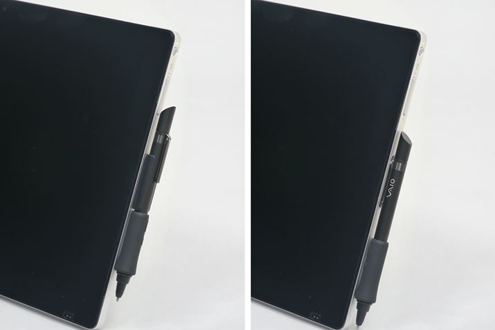 本体にデジタイザースタイラスを内蔵することはできないが、右側面のスリットに付属のペンホルダーを装着して固定できる(左)。ペンホルダーを使わなくても、スリットには磁石が埋め込まれており、デジタイザースタイラスのクリップをつけて簡易的に固定することも可能だ。外出する際は、しっかりと固定できるペンホルダーを使ったほうが紛失を防げるだろう