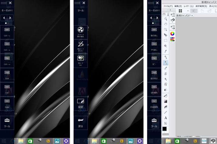 Lボタンにはアプリごとにショートカットキーメニューが割り当てられている。戻る、コピー、貼り付け、再選択など、クリエイティブ系のアプリでよく利用するショートカットキーが画面の横に表示される仕組みだ(表示する場所は上下左右にカスタマイズ可能)。アプリごとに表示するショートカットキーの中身をカスタマイズすることもできる。細かい点だが、Rボタンでタッチパネルを無効にしても、ショートカットキーメニューだけはタッチで操作できるほか、ショートカットキーメニューを表示しても、アプリと重ならないようにする工夫も盛り込まれている。