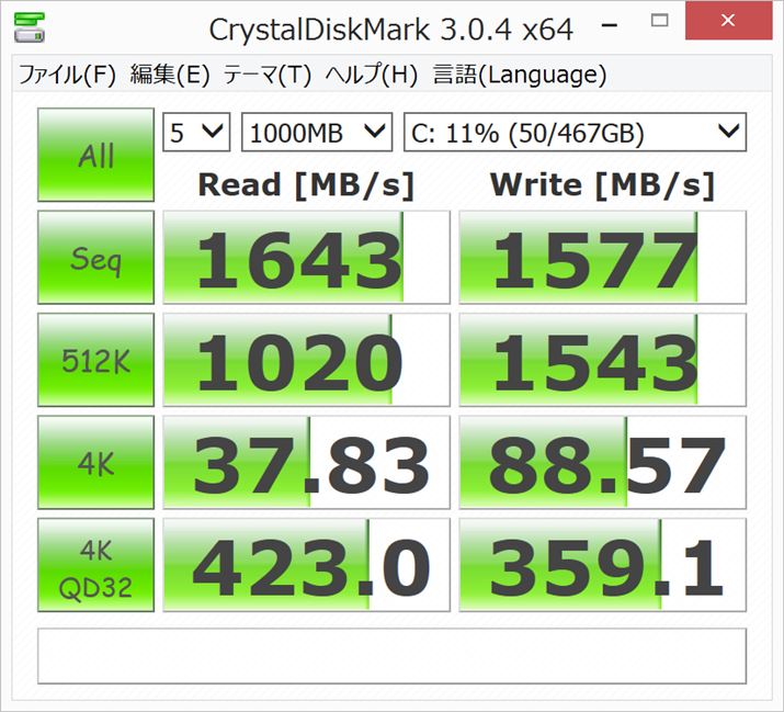 「CrystalDiskMark v3.0.4」(ひよひよ氏作)でSSDの速度を測定。Seq(順次)読み書きで1.6G〜1.5GB/秒という驚異的な速度を記録した