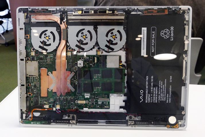 VAIO Z Canvasの内部。3基の大型冷却ファンと2本のヒートパイプにより、TDPが47WのCPUから出る熱を排熱して、レスポンスの低下を防いでいる。新開発のファンは、低回転で個別に周波数制御することで、動作音を抑えている