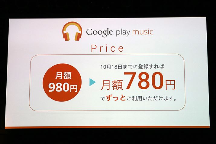 Google Play Musicの利用料金は月額980円。10月18日までに登録すれば、月額780円で使い続けられる特典も用意する
