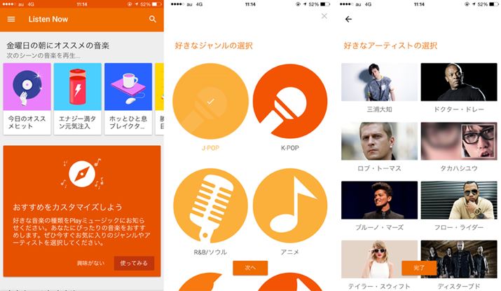 使い始める前に「おすすめをカスタマイズ」を選択し、好みのジャンルとアーティストを選択すると、レコメンドの精度が高まる