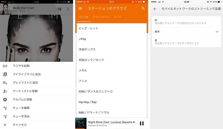 再生画面の右上のボタンをタップすると、画面の下からメニューが表示される(左)。ここからマイライブラリやプレイリストへの追加ができる。ステーションのブラウズではジャンル別にラジオ型の再生が可能(中央)。アクティビティは作業用BGMや通勤・通学、運動といったさまざまなシーンに適した音楽を楽しめる。ストリーミング品質は低・標準・高の3段階から選択可能