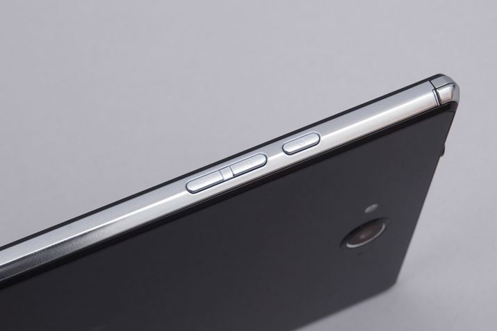右側面には電源やボリュームのボタンがまとめて配置される。側面を覆うメタルのフレームはきらきら光ってカバンの中でも見つけやすい