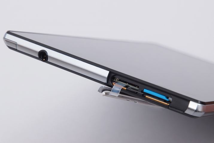 上面には、キャップで覆われたmicroSDXCメモリーカードスロットとnanoSIMサイズ対応のSIMカードスロットが備わる