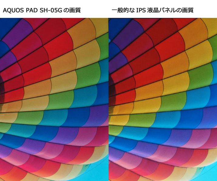 IGZO液晶とPureLEDを組み合わせたAQUOS PADのディスプレイは色の再現性が高く、右の一般的なIPS液晶では飽和している濃い赤や青の表現が再現できていることがわかる