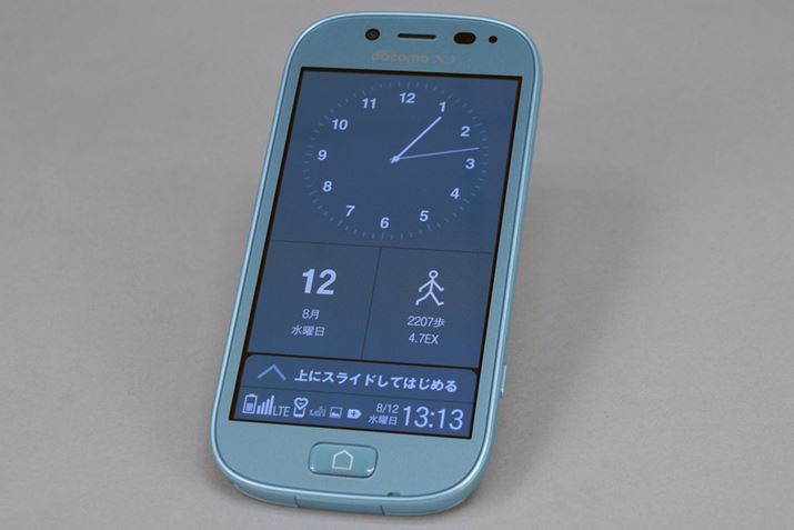 ボディを見ると、通常のAndroidスマートフォンでは前面に3個備わるボタンが「ホーム」ひとつに集約されていることに気付く。また、ディスプレイのタッチパネルは、あえて少し重めにチューニングされた「らくらくタッチ」が採用されており、タッチ操作が実感しやすくなっている。らくらくタッチは設定で、通常のスマートフォンと同じ操作感覚に切り替えることも可能だ。