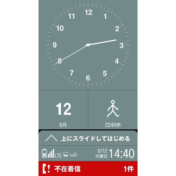 ロック画面は視認性にすぐれたアナログ時計とカレンダー、歩数計、メールや着信などの通知機能で構成されている