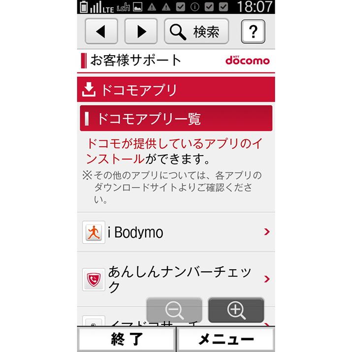 ホーム画面から「dメニュー」→「お客様サポートへ」→「ドコモアプリ」→「アプリ一覧」と画面を進めることで、追加可能なアプリの一覧が現れる