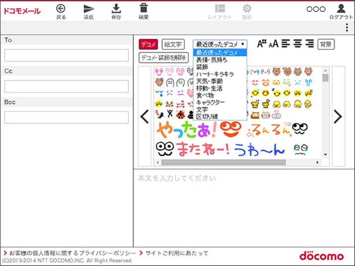 ドコモメールはPCやタブレットなどのWebブラウザーからアクセスができる。もちろん絵文字やデコメにも対応している